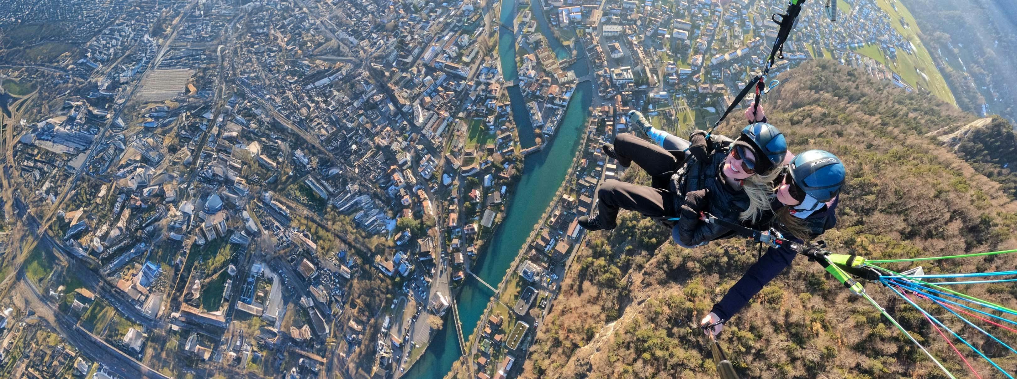 Soar above turquoise lakes and snowy peaks while paragliding, skydiving or hang gliding – an unforgettable perspective of the Swiss Alps.